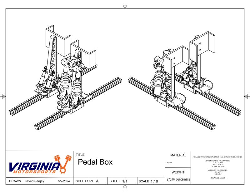 For the 2023-2024 season, I was responsible for designing the pedalbox for the cockpit/controls subteam. Since we were transitioning to an electric vehicle, the pedalbox required a complete redesign. Success criteria included a >25% reduction in both weight and footprint from the previous year, a brake pedal that could withstand a load of 2000N with a reasonable factor of safety per rules, an adjustment range to accommodate 5th percentile females to 95th percentile males, and a redundant accelerator pedal position sensor (APPS) for fault-tolerance.