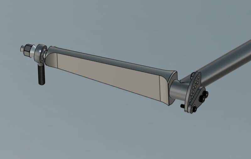 For adjustment, I designed an index plate mechanism that allowed for 10 discrete adjustment points between 0 and 90 degrees, using a tab welded to the torsion bar section with a series of offset holes to allow for more adjustment fidelity while maintaining proper tear-out. The indexing lobe is attached to the blade via two threaded holes with safety wire bolts in the top. The blade housing is a section of coped tube that is welded directly on to the torsion bar.