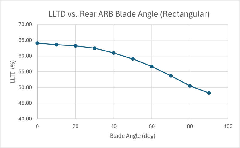 A key design tradeoff was observed during design: the more system stiffness provided by the blades, the greater the resolution but the less the adjustment range, and vice versa. After some iteration, taking into account LLTD adjustment range/resolution and system weight, the average adjustment LLTD resolution was 2.2%, which was deemed acceptable for this application due to packaging limitations.