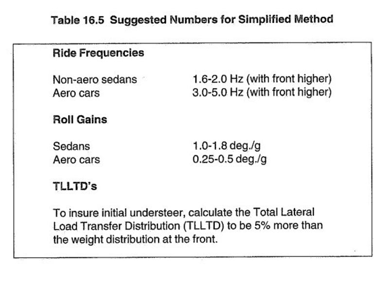 Table of suggested ride frequencies from Race Car Vehicle Dynamics (Milliken)