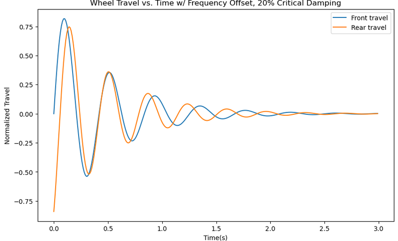 To establish a rear ride frequency that minimized pitch sensitivity of the vehicle, we find the frequency at which the rear's oscillation will "catch up" to the front at 40mph when subject to an impulse, yielding the following: